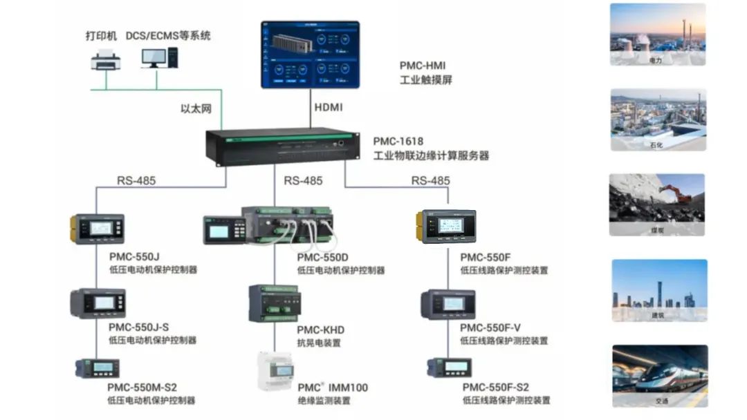 方案采用“ 智能网关+组态软件+边缘应用APP ”一体化设计,集成边缘计算服务器、 PMC-550系列智能型电动机保护控制器等产品,实现对现场低压电动机的集中监测、控制与管理,便于用户掌握电机运行特性,分析各类电机故障原因,实现设备的故障预警分析、智能化运维管理等多种功能。