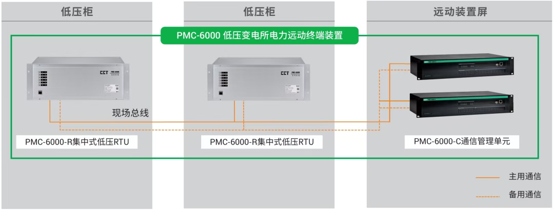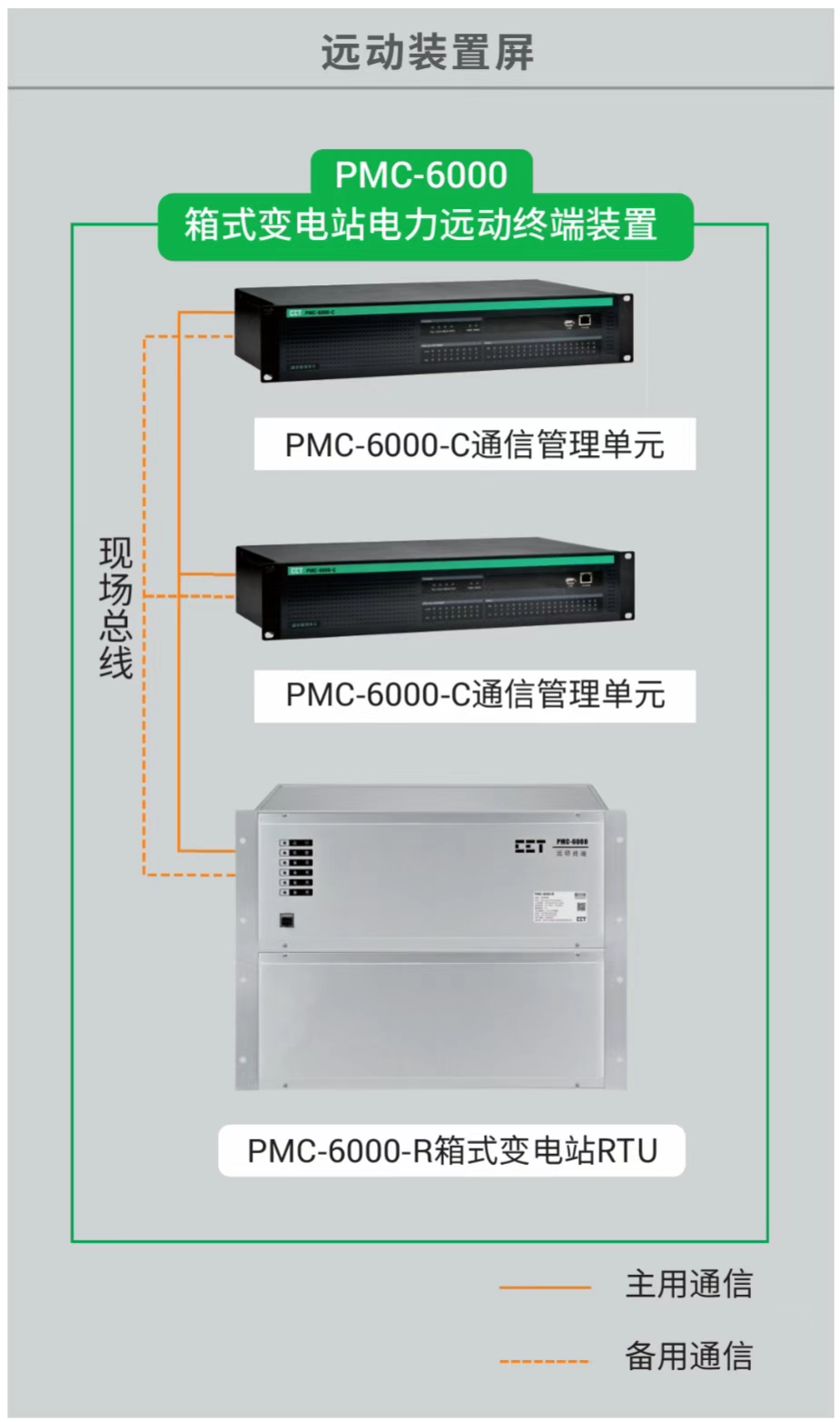 由主备冗余的通信管理单元(PMC-6000-C)+单台8U箱式变电站RTU(PMC-6000-R)组成,支持高压母线、低压母线及重要回路(进线、出线)的全面监控,适配铁路沿线分散式箱变的无人值守需求。