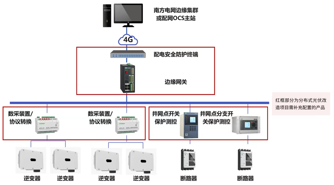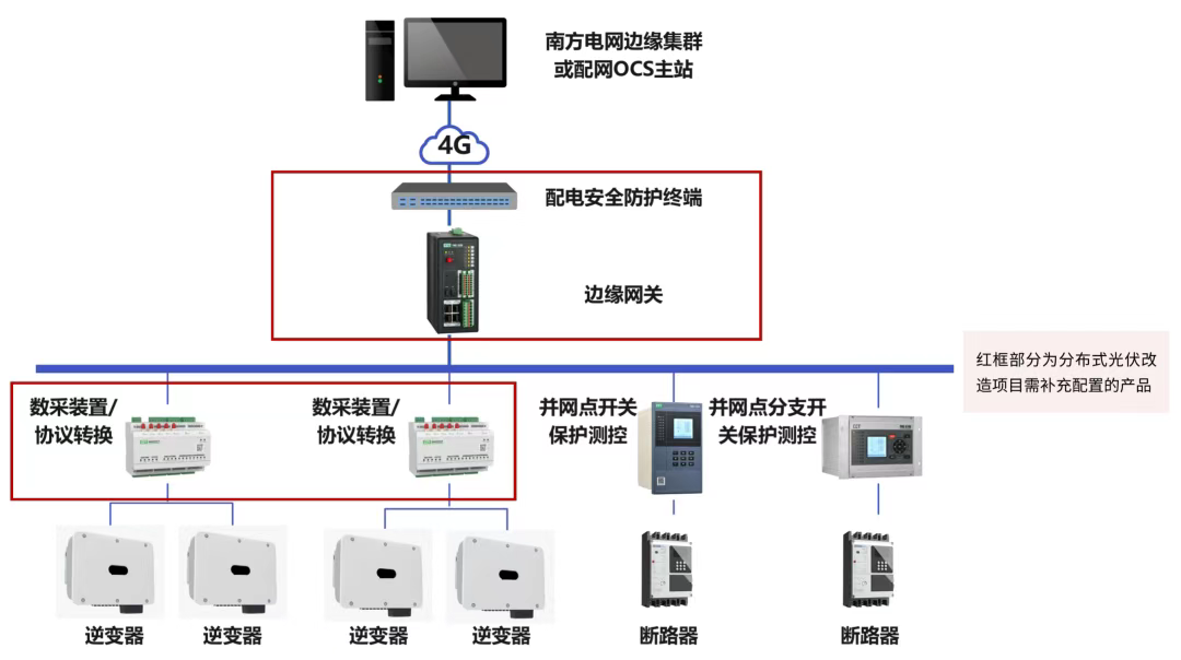 实施方案后,数采装置用于直采逆变器数据并实现协议转换给边缘网关,边缘网关实现AGC/AVC功率调控,与配电安全防护终端配合上传至边缘集群或配网主站。