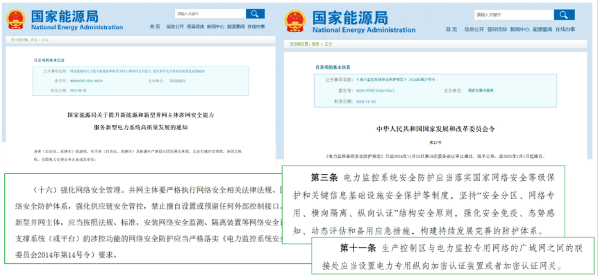 同时,为进一步提升新能源和新型并网主体涉网安全能力,在国家能源局发布的《关于提升新能源和新型并网主体涉网安全能力 服务新型电力系统高质量发展的通知》中提出:“采用云平台等互联网技术进行监测的新能源和新型并网主体,应当按照法规、标准,安装网络安全监测、隔离装置等网络安全设施。” “虚拟电厂的技术支撑系统(或平台)的涉控功能的网络安全防护应当严格落实《电力监控系统安全防护规定》。”